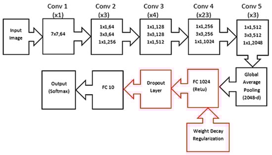 Initially, ResNet50 was utilized [38] by changing the number of neurons in the FC layer to account for the 10 classes in the LSCIDMR dataset as compared to the 1000 item categories in ImageNet. Figure 3 displays the modified ResNet50 architecture exploited to train the LSCIDMR dataset. Moreover, we initially tested the training-from-scratch method using the basic ResNet architecture. With this strategy in mind, it was observed a clear overfitting occurrence where the network overfitted the training data. The train-test performance bias, which is calculated as the difference between train and test accuracy, illustrates the network’s lack of generalizability because of the overfitting phenomenon.