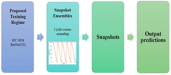 Proposed SnapResNet architecture. In the FC-1024 ResNet152 model, we apply snapshot ensembling with cyclic cosine annealing to then, in return, obtain snapshots where the model accuracy was higher. Now, the proposed model is converted into SnapResNet152 that is used to classify images.