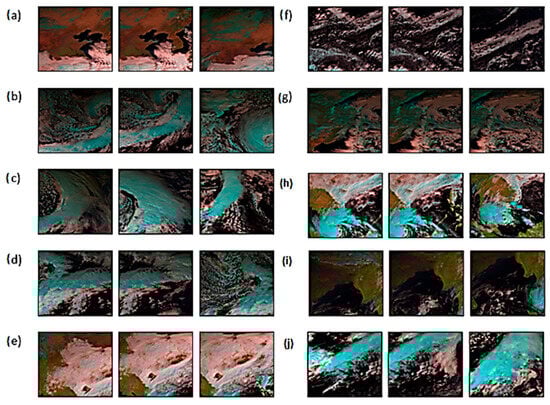 Images from LSCIDMR-S: Example of some images from ten classes. There are 40,625 images within ten classes. (a) Desert, (b) extratropical cyclone, (c) frontal surface, (d) high ice cloud, (e) low water cloud, (f) ocean, (g) snow, (h) tropical cyclone, (i) vegetation, (j) westerly jet.