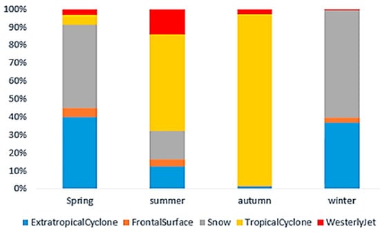 A statistical analysis of the proportion of images of each weather system in different seasons is shown. The seasons are divided according to the northern hemisphere.