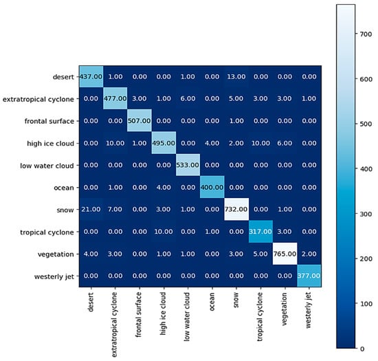 The model was trained and tested using an LSCIDMR obtained by the Himawari-8 satellite. This is the first weather satellite capable of taking color images and monitoring authentic cloud images. The 11 classes are represented by the 104,390 high-resolution (256 × 256) images in LSCIDMR. The temporal resolution is 10 min, and the spatial resolution is 2.0 km. The dataset contains descriptions of four systems as shown in Table 2. (1) Weather system: A weather system includes a tropical cyclone, extratropical cyclone, frontal surface, westerly jet, and snow. (2) Cloud system: The cloud system is made up of high ice clouds and low water clouds. (3) Terrestrial system: This group includes the ocean, the desert, and the vegetation. (4) Label-less. Both single and multiple-label annotations, known as LSCIDMR-S as shown in Figure 9 and LSCIDMR-M, respectively, are available for the dataset. The labels are carefully annotated, yielding a total of 40,625 single labels and 414,221 multiple labels.