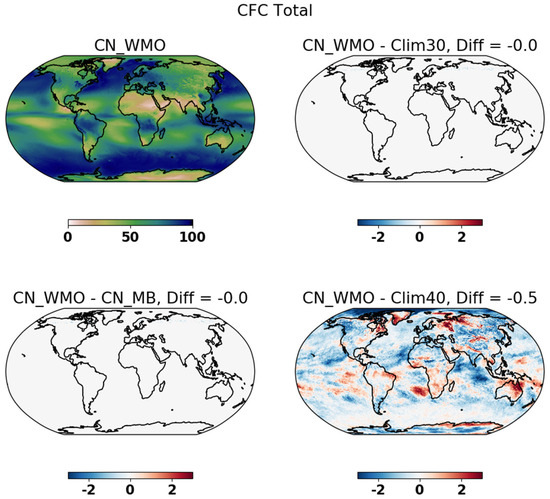 The absolute values of CN_WMO for the total cloud fraction (in %) together with the differences (also in %) between CN_WMO and the monthly based climate normal (CN_MB) and the two climatologies (Clim30 and Clim40). The numbers in the titles of subplots show the global mean differences. The spatial resolution of the equal angle lat–lon grid is 0.25 degrees.