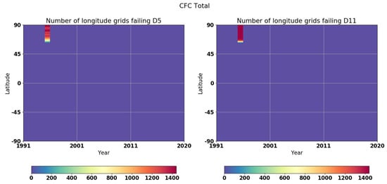 Latitude–time histograms showing the number of longitude grids failing either the D5 or the D11 condition when computing climate normals of total cloud fraction. Maximum number of longitudes grids can be 1440 since the spatial resolution in 0.25 degrees. The resolution on the Y-axis (latitude) is also 0.25 degrees.