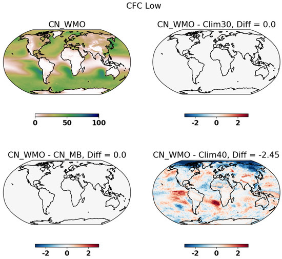 When the total cloud fraction is sub-divided into contributions from low, middle, and high clouds, CN_WMO, CN_MB and Clim30 are also exactly identical. This is shown in Figure 3 in the case of low cloud fraction. This shows that all valid outcomes of cloud detection lead to the successful classification into low, middle, or high cloud types. This data completeness further enables the successful computation of CN_WMO. Similar results were also found for the middle and high clouds (not shown here).