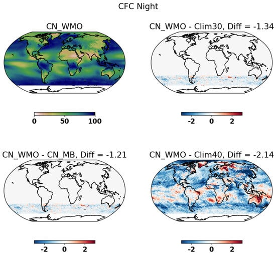 Another interesting feature to note in Figure 4 and Figure 5 is the global mean difference between CN_WMO and Clim40. This difference is much stronger in the case of nighttime cloud fraction compared to its daytime counterpart. This is due to the fact that this difference is driven mainly by the strong decreases in mid- to high-latitude clouds over the oceans during nighttime, while, in the case of daytime, the increases in low-level oceanic stratocumulus clouds in the southern hemisphere reduce this difference. These results, presented in Figure 4, Figure 5, Figure 6 and Figure 7, show the complexity of the situation and the sensitivity of CN_WMO computation to various factors such as variable definition and orbital and programmatic configurations.