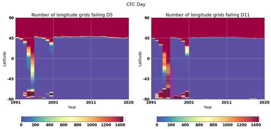 Latitude–time histograms showing the number of longitude grids failing either the D5 or the D11 condition when computing climate normals of daytime cloud fraction. Maximum number of longitudes grids can be 1440 since the spatial resolution in 0.25 degrees. The resolution on the Y-axis (latitude) is also 0.25 degrees.