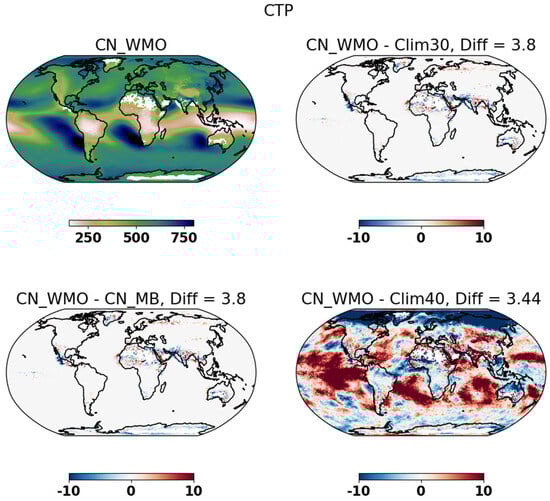 Figure 8, Figure 9 and Figure 10 show the similar results to Figure 4, Figure 6, and Figure 7, but for the cloud top pressure. Here, we note that CN_WMO could not be computed over the desert regions in the tropics, as well as over the parts of Greenland and Antarctica. There are also some differences between CN_WMO and Clim30 over other regions peripheral to these data gaps. These gaps in climate normals of cloud top pressure can be explained by the following factors. First and foremost, it is physically possible that, in the desert regions and few other tropical regions, clouds may not develop every day and clear sky conditions could prevail for longer times within a month. This is especially the case during the drier summer and winter months. This means that the D5 and/or D11 conditions are not satisfied in practice, since the cloud top pressures are naturally retrieved only when clouds are present. It is, therefore, clear that the WMO guidelines are not suitable in this case.