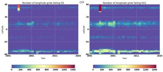 Latitude–time histograms showing the number of longitude grids failing either the D5 or the D11 condition when computing climate normals of cloud top pressure. Maximum number of longitudes grids can be 1440 since the spatial resolution in 0.25 degrees. The resolution on the Y-axis (latitude) is also 0.25 degrees.