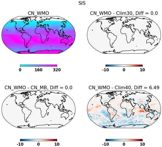 Figure 11 shows the true climate normals of SIS and the differences with respect to CM_MB, Clim30, and Clim40. Similar to the results shown for total cloud fraction before, there are no differences between CN_WMO, CN_MB and Clim30. This shows the progress made in data completeness both at the Level 2 daily and Level 3 monthly mean levels in the CLARA-A3 climate data record. An interesting feature to note here is that the difference between CN_WMO and Clim40 for SIS correlates well with the similar difference for the daytime and low-level cloud fractions shown before. For example, in those regions located off the western coasts of South America and southern Africa where the stratocumulus clouds show statistically significant increases, the incoming surface solar radiation has correspondingly decreased in the latter 30-year period compared to Clim40. An opposite feature can be observed in the Indian Ocean.