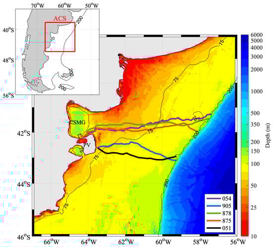 SESs colonies are located within the Antarctic Circle, except for the one located at Península Valdés (PV), in South America (Figure 1). While at sea, the spatial distribution of females and males is quite different []. Males forage mostly on the Patagonian shelf [] and females mainly along the Patagonian shelf slope, shelf break, or Argentine Basin [,,,]. SESs females breed between late August and November and molt between December and January along ca. 200 km of open ocean coastline at PV [,]. SESs have been instrumented in PV since 1992 []. The oceanographic data collected by the PV colony have been used to study mesoscale structures in the open ocean [], identify foraging places [], and relate the species that the SESs eat to different water masses along the Patagonian shelf slope []. Based on the SESs path, speed, and swimming pattern, Campagna et al. [] suggested that the shelf area is mainly a transit zone and is not the preferred feeding ground of the SESs females of PV. This was recently confirmed by McGovern et al. []. Here we propose to use T and S data to characterize the oceanographic conditions along the trajectories of the SESs within the continental shelf, taking advantage of the fact that they crossed it very fast. Indeed, the high-resolution profile data collected by SESs will provide a synoptic description of the oceanographic conditions of the Argentine Continental Shelf (ACS) adjacent to PV.