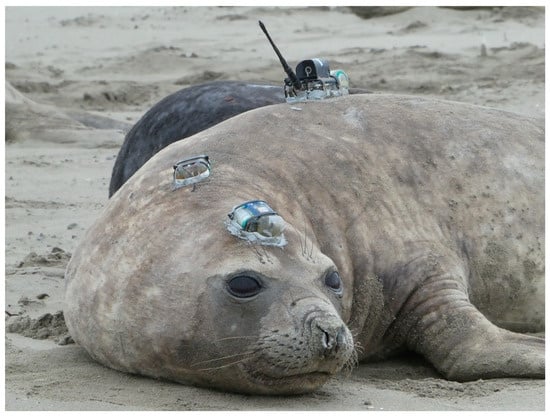 Thanks to the fact that Southern Elephant Seals (SESs) dive almost continuously [] to deep waters (up to 2000 m) [,], on the order of 60 times per day [,], and travel thousands of kilometers [,], they represent excellent platforms to measure data in the water column of the ocean. SESs show strong site fidelity, returning reliably to natal breeding grounds twice a year, allowing for both attachment and recovery of instruments. The in-situ data collected allows us to study in detail the behavior of those animals and, simultaneously, allows us to evaluate the seasonal and interannual variability of key oceanographic parameters [].
