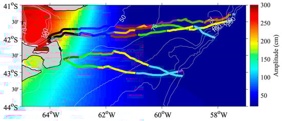 The SESs crossed the ACS in a few days with a mean speed of 1–1.5 m/s, similar to the values documented by Campagna et al. [] and one order of magnitude higher than the geostrophic velocities in the area []. We show for the first time that SESs speed might be modulated by tidal currents: the speed of the three northern SESs showed a semi-diurnal cycle that correlates with the macro-tidal regime observed close to the coast, north of 42°S. South of 42°S, this oscillation is not observed since the tidal velocities are not as large as in the northern region.