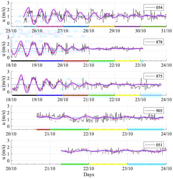 The zonal component of the SES swimming velocity (black) and the tidal current velocity derived from TPXO (magenta) along the five trajectories. The mean value along each trajectory of the in-situ velocity (blue line) was added to the tidal currents. A threshold of two standard deviations was used to eliminate the outliers from the in-situ velocity data. The colors on the x-axis match the colors along the trajectories in Figure 3.