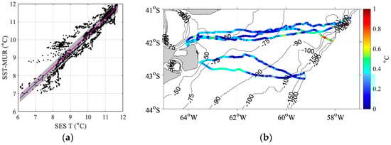 Sea Surface Temperature (SST) from the Multi-scale Ultra-High Resolution L4 product (MUR—https://podaac.jpl.nasa.gov/MEaSUREs-MUR, accessed on 31 August 2021) with daily resolution and spatial resolution of 0.011° × 0.011° is used to compare the surface temperature obtained by the SESs. This high spatial resolution product is generated by combining MODIS, AVHRR, GOES, AMSR-E, and TMI measurements through the technique known as multi-resolution variational analysis []. The choice of this product is due to its high spatial resolution, and it has been successfully compared with independent in-situ data in this study region [,].