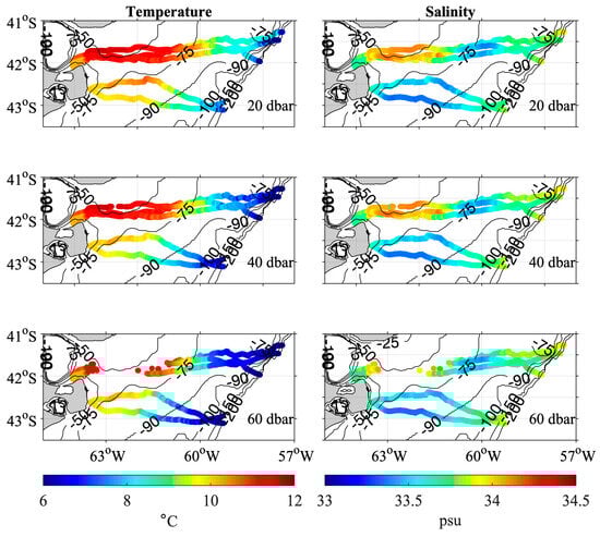 The spatial distribution of the temperature along the trajectories displays a zonal gradient, observing warm (warmer than 11 °C) water in the inner shelf and cold (colder than 6 °C) water in the outer shelf (Figure 6, left column). This is in good agreement with similar in-situ observations presented by Campagna et al. []. The zonal temperature gradient is evident in the three pressure levels (Figure 6, left column). The cold water close to the shelfbreak is associated with MC waters. A meridional gradient in the inner and middle shelves is also evident, showing that, north of 42°S, the surface temperature is 1 °C warmer than in the south (Figure 6).