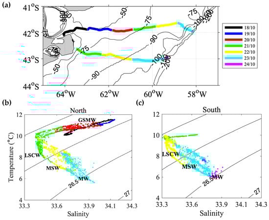 The LSCW and MSW were sampled by the southern and northern SESs on the 22 and 23 of October (Figure 7). These water masses originate in the coastal Pacific Ocean and are transported by the Patagonian current [].