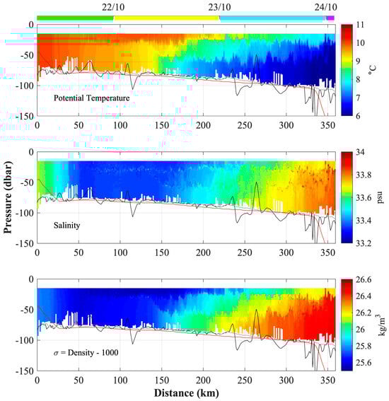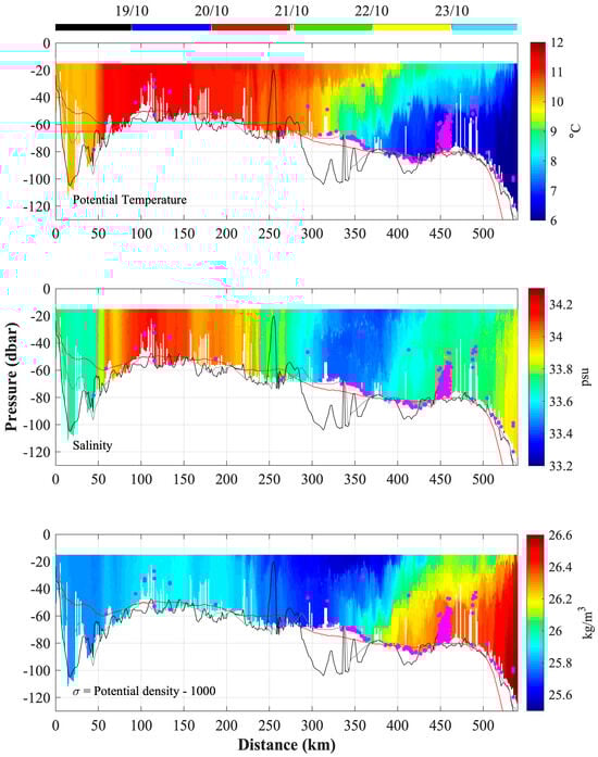 The vertical structure of the temperature is homogeneous from the surface to the bottom in the first 300 km from the coast (Figure 8, upper panel). During the first day after departure from the north of PV (19 October 2019), the potential temperature profile displays several increases and decreases in temperature (between 10 °C and 11 °C). From km 300 towards the shelf break, a vertical stratification begins, which is accentuated towards the slope with temperatures of 8 °C on the surface and 6 °C on the bottom (Figure 8 upper panel).