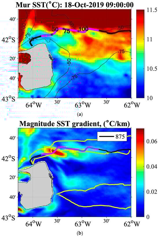 The analysis of Figure 8 in conjunction with the analysis of the spatial distribution of T and S (Section 3.4) and the TS diagrams (Section 3.5) allows us to identify that the warm and salty region (between km 80 and km 250, Figure 8) corresponds to the HSCW from SMG. The strip pattern observed in T and S the first day after its departure indicates that the SES swam across different water masses at the beginning of its trip. To further understand these features, we used satellite SST images that showed excellent agreement with the in-situ data (Section 3.3). On the 18th of October 2019, SST agreed to an alternating pattern of increasing and decreasing values (Figure 9a) that agreed with the pattern observed in Figure 8. The spatial pattern of SST indicates that the relative cold water is advected from the south into the SMG and that the relative warm water corresponds to HSCW. Moreover, the monthly average of 17 years of SST gradient reveals that in October there is a strong and persistent front (0.06 °C/km) at 41.9°S and between 63.3° and 63.6°W (Figure 9b). The front separates warm and salty water from SMG and cold and fresh water from the southern portion of the adjacent shelf. The Northern SES crossed this frontal area, explaining the abrupt temperature changes observed in Figure 8. Figure 9 also indicates that the other two northern SESs crossed the frontal area. The frontal area north of PV has been reported in Pisoni []. Using SST satellite images, they show that it is a seasonal front that exists during winter and the beginning of spring. The TS values recorded by the SESs in conjunction with SST images show that the front separates fresh and cold waters that enter the SMG in the narrow region between the coast and the front from warm and salty water created in the SMG, north of the front. The water entering the SMG comes from the coastal region east of PV, where a strong upwelling took place [].