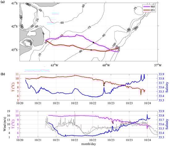 The spatial patterns of T and S at different pressure levels also indicated that the 75 m isobath delimited the vertically homogeneous region from the stratified one. Indeed, the 75 m isobath corresponds with the position of the largest increment of the Simpson parameter computed along the SESs trajectories. The Simpson parameter at the 75 m isobath is 10 J/m3, a rather low value compared with values commonly found in the region to separate coastal mixed waters from open ocean stratified waters [,,]. This is probably due to the fact that our estimation of the Simpson parameter has been conducted in austral spring (mid-October), a period of the year when the vertical stratification over the continental shelf is much lower than in austral summer, when the other estimations have been conducted [,].
