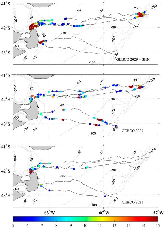 The maximum depth reached by the SESs is higher than reported in bathymetric charts from GEBCO (2019 + SHN, 2020, and 2021) along several portions of the trajectories (Figure 8 and Figure 10). Thus, the depths reached by the SESs may be a useful variable to calibrate/validate the bathymetric charts. Here, a quantitative comparison is presented between the maximum depth reached by SESs and the corresponding value provided by bathymetric charts (Figure 10). Note that we neglected the cases where the depth reached by the SESs was lower than the GEBCO products since we cannot guarantee that the SESs reached the sea floor. Most of the discrepancies are observed near the coast for the three datasets, especially in the northern trajectories, reaching values larger than 10 m (Figure 12). The lowest bias values (< 9 m) are observed on the middle shelf for GEBCO 2019 + SHN and GEBCO 2021. GEBCO 2019 + SHN underestimates the depth on the outer shelf with values larger than 12 m. Figure 12 also revealed that GEBCO 2020 undervalues the depth throughout the trajectories. The histogram of the bathymetry differences higher than 5 m (Figure 13) confirms that GEBCO 2021 is the bathymetry chart that presented the lowest number of cases where the depth reached by SESs is higher, suggesting that it is the best option available to represent the bathymetry in the region.