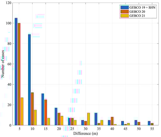 Histogram of the bathymetry differences higher than 5 m between depths reached by SESs and bathymetric charts: GEBCO 2019 + SHN (dark blue), GEBCO 2020 (red), and GEBCO 2021 (dark yellow).