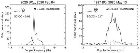 where is the transmitted power, is the wavelength, and are the antenna gains, respectively, for transmission and reception (or equivalently, times the effective aperture of the antenna), and and are the target’s distance, respectively, from the transmitter and the receiver. For Earth-based observations of planetary objects, even for bistatic observations, whereas for a space-based observation the two distances could be significantly different. The received signal’s polarization information may also be recorded, as is described in detail in Section 3.6. In Figure 2, two senses of circular polarizations are included: same-circular (SC) polarization and opposite-circular (OC) polarization with respect to the transmitted signal, as well as the ratio of the radar cross-sections in the SC polarization to that in the OC polarization, i.e., the circular polarization ratio (CPR or SC/OC ratio).