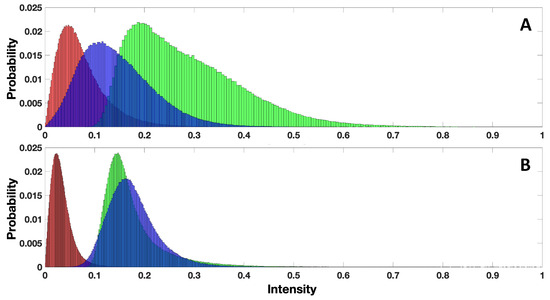 Histogram of the decomposition components, in terms of probability, from the A and B units noted in Figure 6 (A: the crater floor and walls, and B: a smoother area nearby). Color coding follows the red, blue, green of the decomposition method.