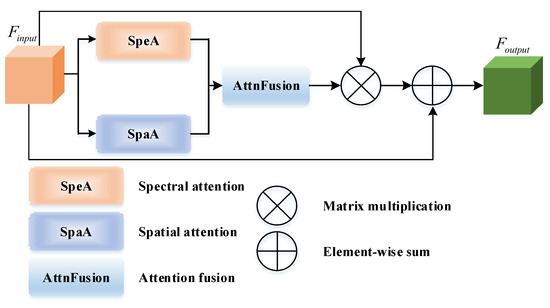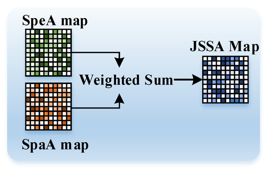 In this subsection, we provide a detailed exposition of the joint spectral–spatial attention (JSSA). Firstly, the pipeline of JSSA is depicted in Figure 3. In essence, JSSA simultaneously employs SpeA and SpaA. Subsequently, an attention fusion layer performs post-fusion, employing weighted summation of the attention maps generated by SpeA and SpaA. This architectural choice facilitates the generation of the JSSA’s attention map, which jointly evaluates pixel-wise correlations across both the frequency and spatial domains. To elaborate further, this process effectively captures and aggregates spectral and spatial contexts, subsequently enhancing feature refinement. This is followed by a matrix multiplication and element-wise summation, resulting in the acquisition of JSSA-refined representations. The precise steps are elucidated below.