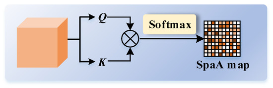 In the top branch of SpeA, is transposed to obtain the query feature (Q in Figure 4) , while the key feature (K in Figure 4) is with . The attention map can be formed as