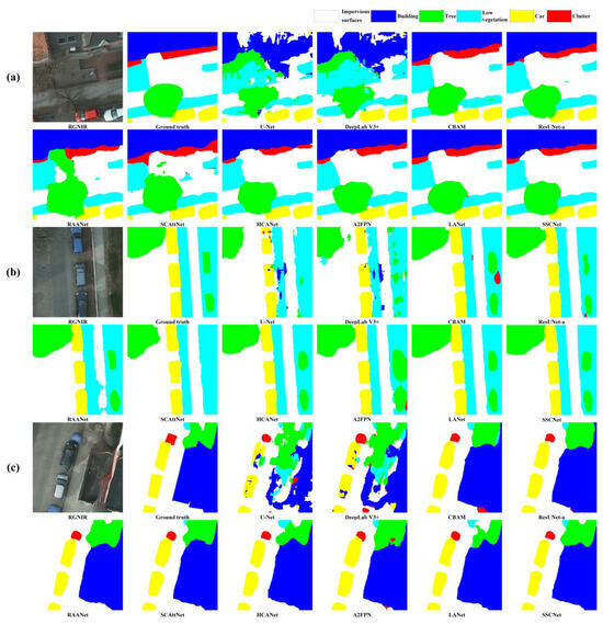 (a–c) Visual inspections of random samples from test set of ISPRS Potsdam.