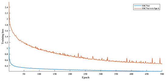 Transitioning to the LoveDA dataset, SSCNet again delivers commendable results, with an AF of 76.02, an OA of 72.01, and an mIoU of 65.91. These metrics indicate SSCNet’s ability to perform well on this dataset, exhibiting its adaptability. However, when the SpeA module is omitted (SSCNet w/o SpeA), there’s a more substantial drop in performance across all metrics. The model’s AF decreases to 60.16, OA to 62.65, and mIoU to 54.62. Moreover, as drawn in Figure 11 and Figure 12, we observe that SpeA significantly improves the convergence rate while keeping a lower loss than before. This significant reduction reaffirms the importance of the SpeA module in SSCNet, as its removal leads to a noticeable decrease in segmentation accuracy and overall performance.
