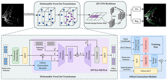 To solve the problems above, we present a novel and efficient module called the deformable voxel set attention (DVSA) module for detecting objects in 3D point clouds. In general, the transformer-based 3D point cloud detection backbone has a larger receptive field, which enhances its representation capabilities. However, in object detection tasks, excessive attention to background areas is unnecessary and resource-consuming. Therefore, considering that the deformable mechanism can selectively focus on the target area, we tried to build a transformer backbone that selectively focuses on the foreground target area for 3D point cloud object detection. The target-region-sensitive deformable attention is constructed considering two factors when introducing the deformable mechanism. One factor is that performing operations involving the offset of all pixels in the deformable convolutional network feature map leads to a significant computational burden, and it also introduces confusion in the target area due to the offset of background points. Another factor is that, compared to only learning a few sets of query-independent offsets in 2D deformable attention, it is better to learn offsets for foreground queries to move the keys and values of the targets to important areas. Therefore, after the DVSA module divides the point clouds in the scene into foreground points and background points, it uses the newly constructed offset generation network to learn the offsets of the foreground queries. Then, the offset features carrying offset information are projected into keys and values, and the calculation of deformable attention is completed together with the input projected queries.