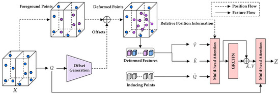 Deformable mechanisms are commonly incorporated into 3D object detection models using point clouds to enhance the extraction capability of salient and discriminative features. Bhattacharyya et al. introduced the Deformable PV-RCNN [19] model by integrating deformable mechanisms into the PV-RCNN. This model adaptively extracts informative and discriminative features through deformable convolution operations. Subsequently, Bhattacharyya et al. developed the deformable self-attention (DSA) module in SA-Det3D [20]. This module calculates offsets for sample points obtained through farthest-point sampling, extracting context information containing representative and informative feature subsets. Recognizing that relevant object information is mainly located in adjacent positions, Chen et al. proposed a deformable cross-attention feature alignment module [21]. This module guides the aggregation positions in the feature map using deformable convolutions. To learn more effective contextual features, Tang et al. designed a deformable offset self-attention (DOSA) structure [39]. This structure first samples a voxel subset using the farthest point sampling method and then learns offsets for this voxel subset. Offset self-attention is performed on the voxel subset, which is upsampled to cover each original voxel position.