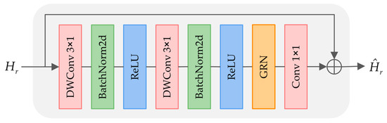 After encoding deformable features into the hidden space using inducing points, the hidden features are input into a feed-forward network to achieve more flexible and complex feature refinement. In a previous study [14], the hidden features were scattered into a 3D sparse tensor, and a ConvFFN was constructed to learn the information in the corresponding tensor. While this approach successfully captures inter-voxel information interaction, it may impede the model’s performance when dealing with deformable features due to limited feature diversity. To address this limitation, ConvNeXt V2 [42] proposed global response normalization (GRN), which normalizes the feature maps channel-wise, thereby enhancing feature competition and promoting feature diversity. Notably, GRN serves as a convolutional neural network layer that requires no additional parameters and has no learnable parameters. In light of this, we introduce the GRN into the ConvFFN to develop an improved version, GRCFFN, specifically designed to amplify feature diversity. The architecture of GRCFFN is illustrated in Figure 3.
