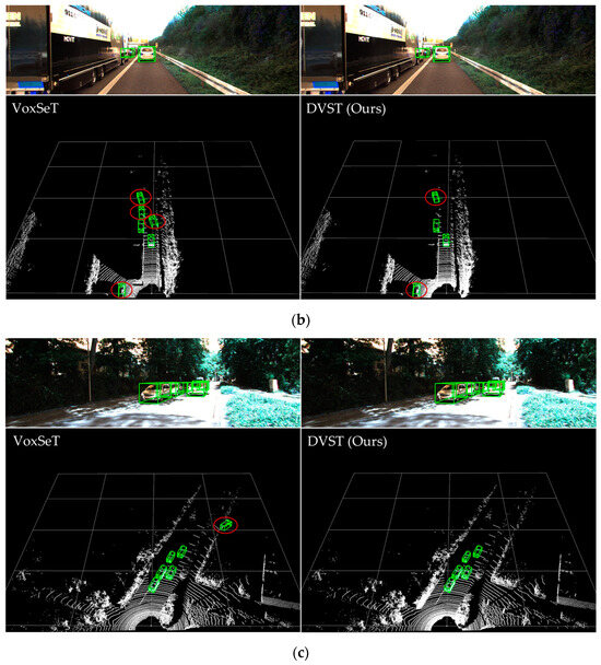 Qualitative analysis results of 3D object detection on the KITTI dataset. Three scenes, denoted as (a–c), are showcased. Each scene includes the ground truth box. The detection results for each scene using VoxSeT and DVST models are depicted on the left and right sides, respectively. False detection targets are circled for clarity.
