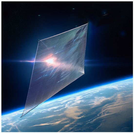 Solar radiation pressure is the basis of the operating principle of photonic solar sails, a class of propellantless propulsion systems that convert solar radiation pressure into thrust []. Among them, the now well-known reflecting solar sails [,] reflect photons thanks to a membrane coated with a highly reflective material. In addition to reflection, other optical phenomena, such as refraction or diffraction [,,], have been studied in recent years to enable momentum transfer between photons from the Sun and the sail-based spacecraft. In particular, a refractive sail generates thrust by deflecting incoming photons through the refraction of sunlight across a thin transparent membrane made of polymeric micro-prisms [,,], while a diffractive sail uses a metamaterial film to diffract incoming photons and deflect them from their natural path [,,]; see Figure 1, which shows a conceptual sketch of a translucent diffractive sail in a low-Earth orbit.