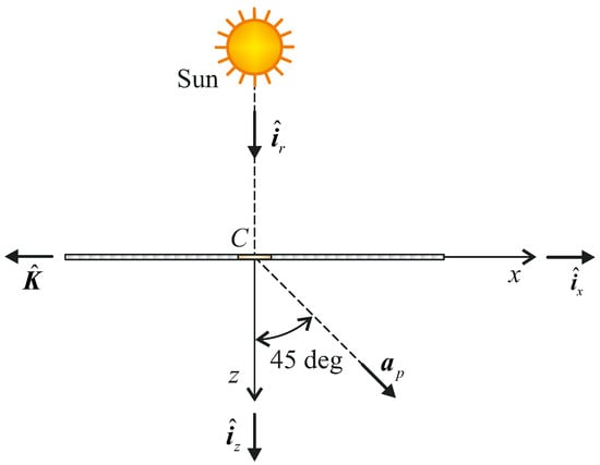 In particular, the plane identifies the nominal plane of the (flat) diffractive sail, and the x-axis direction is opposite to the grating momentum unit vector (i.e., in the figure), which is in turn, aligned with the direction of periodicity of the grating []. Note also that, according to Dubill and Swartzlander [], a Sun-facing diffractive sail with a grating at normal incidence generates radial and transverse thrust components of equal magnitude: that is, the propulsive acceleration vector is tilted 45 degrees with respect to the Sun–spacecraft unit vector , as sketched in Figure 2.