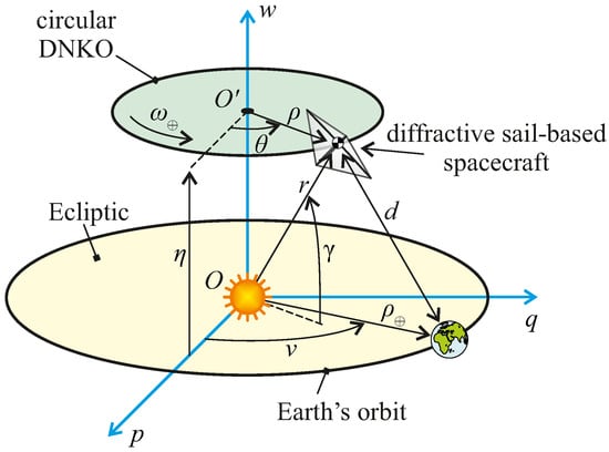 The thrust vector model of a (flat) diffractive sail, described in the previous section, is used here to study the possibility of maintaining circular DNKOs []. With reference to the scheme in Figure 3, we introduce a perifocal reference system , where O is the center of mass of the Sun, the p-axis is aligned with the eccentricity vector of the Earth (omitted in the figure for simplicity), and the w-axis is parallel to the angular momentum of the Earth’s heliocentric orbit. Therefore, the plane coincides with the plane of the Ecliptic, which is represented as a yellow disk in Figure 3.