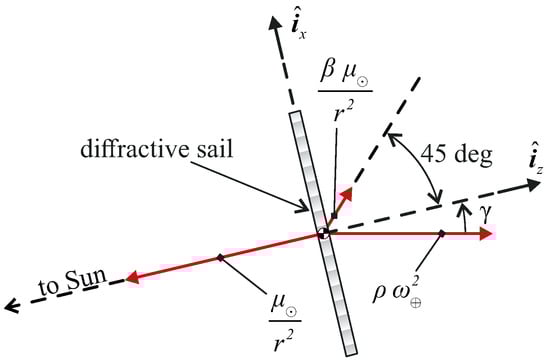 As will be better detailed in Section 3.1, the diffractive sail-based spacecraft is outside the Earth’s sphere of influence (SOI), and therefore, the perturbative effect of our planet can be neglected []. Paralleling the procedure proposed by McInnes [] for the reflecting solar sail and bearing in mind the scheme of Figure 4, the balance between propulsive, gravitational, and centrifugal accelerations acting on the spacecraft results in the following two scalar equations