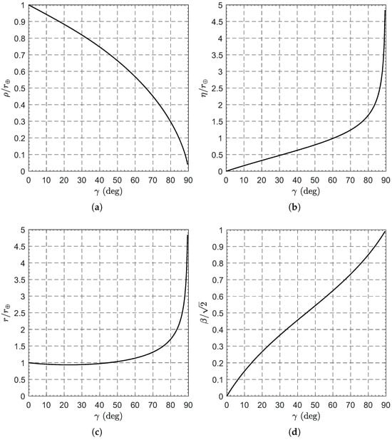 Now, by substituting Equation (7) into Equation (8) and using Equation (5), we obtain the following analytical result, which expresses the radius of the circular displaced orbit as a function of the angle of elevation and the reference distance , viz.