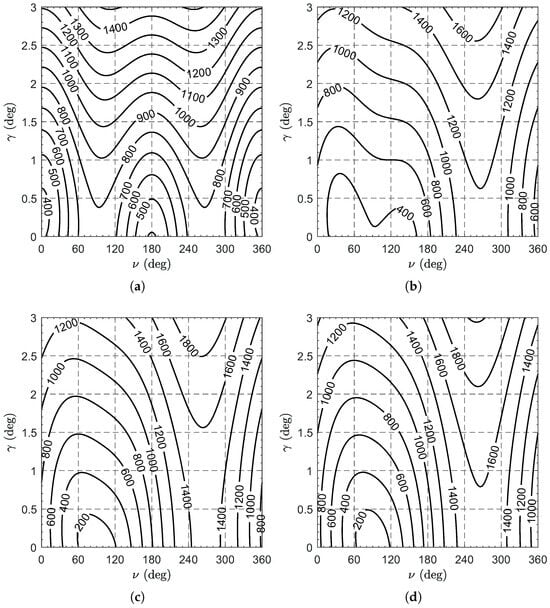 Variation of the spacecraft–Earth distance d with . The contour lines indicate the values of d expressed in units of . (a) . (b) and . (c) and . (d) and .