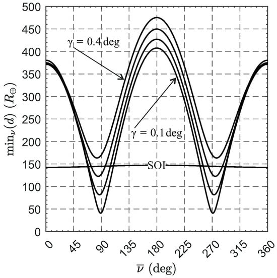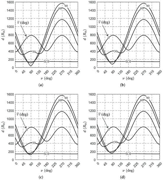 is an explicit function of and is represented in Figure 7 and Figure 8. Note that in the figures the values of d are reported in units of ; that is, in multiples of the Earth’s mean equatorial radius. In addition, Figure 8 also shows the radius of the Earth’s SOI, given by , which is a weak function of , the eccentricity of the Earth’s orbit being much smaller than 1.