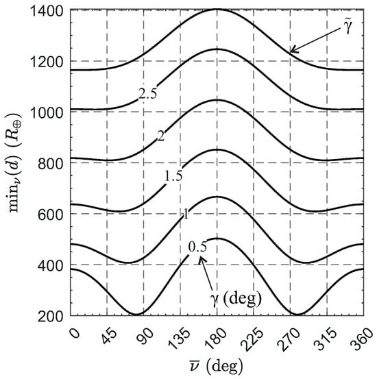 An interesting result is that the condition , which describes the situation in which the angular offset between the spacecraft and the Earth has a zero mean value during the year, does not necessarily imply that the minimum value of d with respect to (i.e., the value of ) is as small as possible. In this regard, consider Figure 9, which shows the variation of with . Two important conclusions can be drawn from that figure.