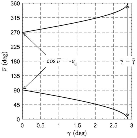 In particular, the spacecraft’s osculating orbit is an ellipse when , a parabola when , and a hyperbola when . Furthermore, the osculating orbit is circular when and, in such cases, . When the osculating orbit is an ellipse, the minimum of a is reached when and its value is , while the corresponding value of e (which is the maximum in the interval ) is . For example, if , then , , , , and .