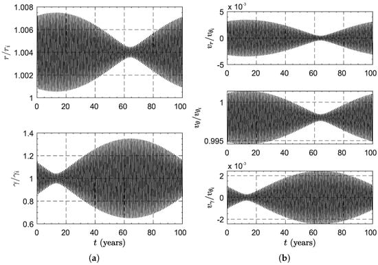 whose reference values are and , and assume that the errors in are . The simulation results involving normalized distance () and elevation angle () are shown in Figure 14a, while the time-variations of the velocity components are illustrated in Figure 14b. From the results it can be concluded that the system is marginally stable (in fact, no damping source is included in the model), even when errors in spacecraft velocity components are considered.