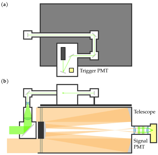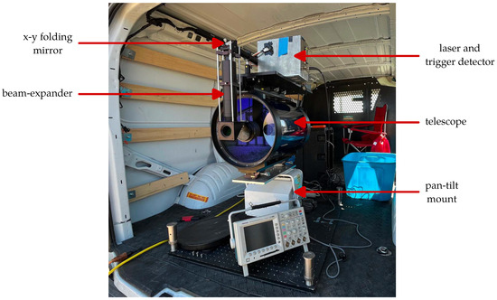 Figure 2 shows an optical schematic of the lidar system, and Figure 3 shows a picture of the lidar system during the experiments. The first component in the transmitting subsystem was the JDS Uniphase NG-10320-100 532 nm laser, which had a pulse width of 0.6 ns, a pulse energy of 3 , and a pulse repetition frequency (PRF) range between approximately 2.9 kHz to 5.4 kHz. The laser was housed in a light-tight box along with a Hamamatsu H6780-20 photomultiplier tube (PMT), the output of which was used as the trigger input for the analog-to-digital (ADC) converter. A series of mirrors and lens tubes directed the light out of the system at the center of the receiver telescope’s central obstruction. Before exiting the system, the beam was expanded to have a 50.8 mm diameter and half-angle divergence of 0.2 .