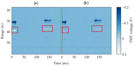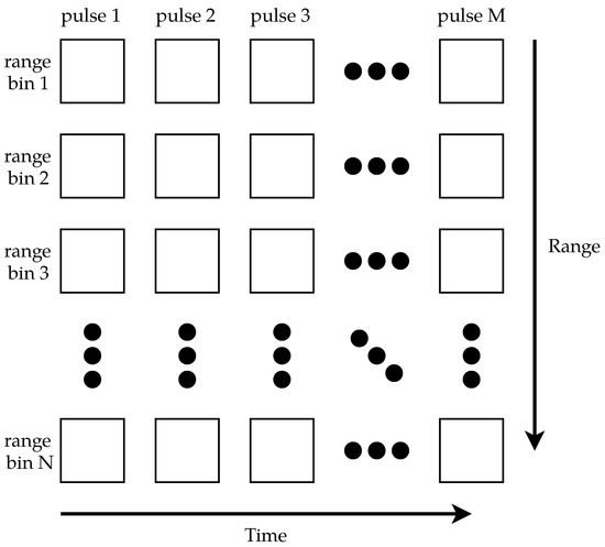 The data were digitized using a Compuscope 14200 PCIe ADC with a 200 / sampling rate, 100 MHz bandwidth, and 14-bit resolution. The 200 / sampling rate limited the system’s range resolution to 0.75 . The output of the H9305-04 PMT was connected to the ADC’s input channel, and the output of the H6780-20 PMT was connected to the ADC’s trigger input. For each laser pulse, the ADC was triggered to collect 200 samples. Due to the transit time for the light to leave the system, as well as variance in when the ADC started sampling, 178 samples were usable [49]. MATLAB was used to control the ADC and collect 1024 pulses, resulting in images of 178 rows (range bins) × 1024 columns (pulses). For compatibility with the ADC, MATLAB 2015b was used. Figure 4 shows a generic example of how the data were arranged into a matrix; the data are later visualized as false-color images. Since the laser’s PRF was not constant, the total duration of 1024 pulses was not constant; this resulted in images of varying durations.