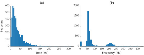 (a) Histogram of bee transmit times. (b) Histogram of estimated fundamental wingbeat frequencies.