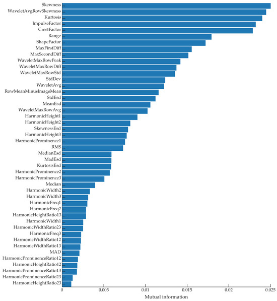 In addition to time- and frequency-domain features, we used generalized Morse wavelets [58] to compute the continuous wavelet scalogram, from which we extracted additional features. Across the time axis in the time-frequency plane, we computed the average intensity for each frequency bin, then selected the maximum of those intensity values. Similarly, we computed the standard deviation of each frequency bin and extracted the mean of those values. We also computed the maximum and mean values of the scalogram, the maximum change between adjacent values in the frequency axis, and the average skewness of the frequency bins. For a full list of features, see the feature ranking in Figure 9 and our code [59].