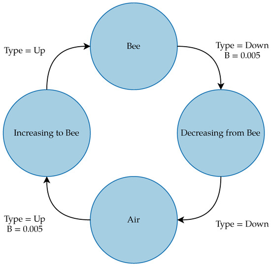 The gfpop (Graph Constrained Functional Pruning Optimal Partitioning) algorithm is a graph-based changepoint detection algorithm primarily created for applications in fields, such as medicine, containing large sequences of data with abrupt changes. The algorithm requires the user to input a built-in or manually created graph consisting of nodes representing the states of the signal, edges for the transitions between states, and a loss function to analyze the graph. The edges for the graph have a variety of parameters, although for this application, the only parameter that was tuned was the penalty on the edges for transitioning between states. The graph for the bee dataset, shown in Figure 10, contained four states representing air, bees, and the increase and decrease from the air to the bee; this graph gave better results than a binary graph of only air and bee states. The edges transitioning from the air to an increase and from the bee to a decrease had a penalty of 0.005. The graph penalties, as well as the procedures described below, were manually tuned on a few images from the training dataset.